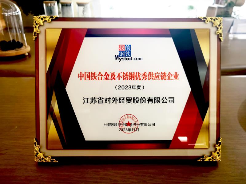 2023年11月15日,2024年國際鐵合金及不銹鋼產業年會在南京隆重召開,江蘇外貿公司受邀參加了此次年會,并榮獲“中國鐵合金和不銹鋼優秀供應鏈企業”稱號。