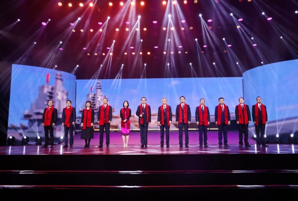 在“奮進(jìn)蘇豪跟黨走”的尾聲環(huán)節(jié),集團(tuán)領(lǐng)導(dǎo)班子步入舞臺,臺上臺下、演員觀眾融為一體,同唱《明天會更好》?;顒幼詈螅w班子成員集體拜年,為本場活動畫上了圓滿的句號。