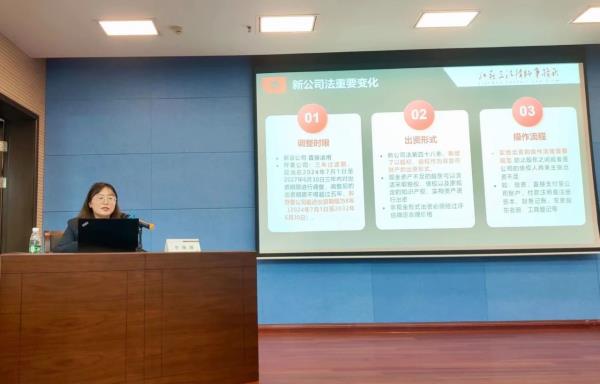 2023年12月29日,十四屆全國人大常委會第七次會議修訂通過《中華人民共和國公司法》,自2024年7月1日起施行。以新《公司法》即將全面實施為契機,為進一步提升企業風險管理水平,2024年5月27日,外貿公司協助蘇豪控股集團舉辦風控法務大講堂,邀請江蘇三法律師事務所合伙人李珊珊律師作主題為《新公司法重要變化》的專題講授。本次大講堂由外貿公司總法律顧問、法審合規部總經理陳其南主持。